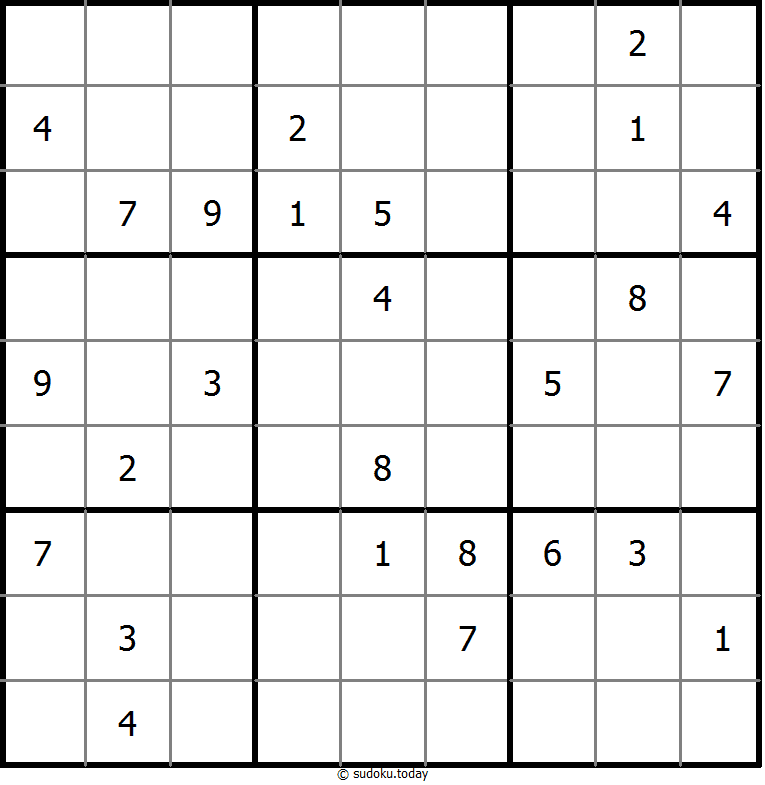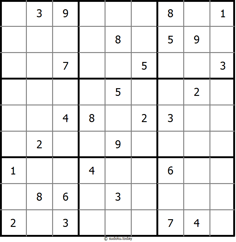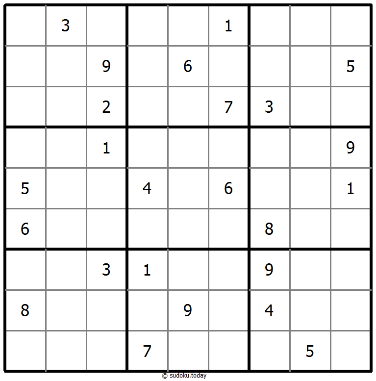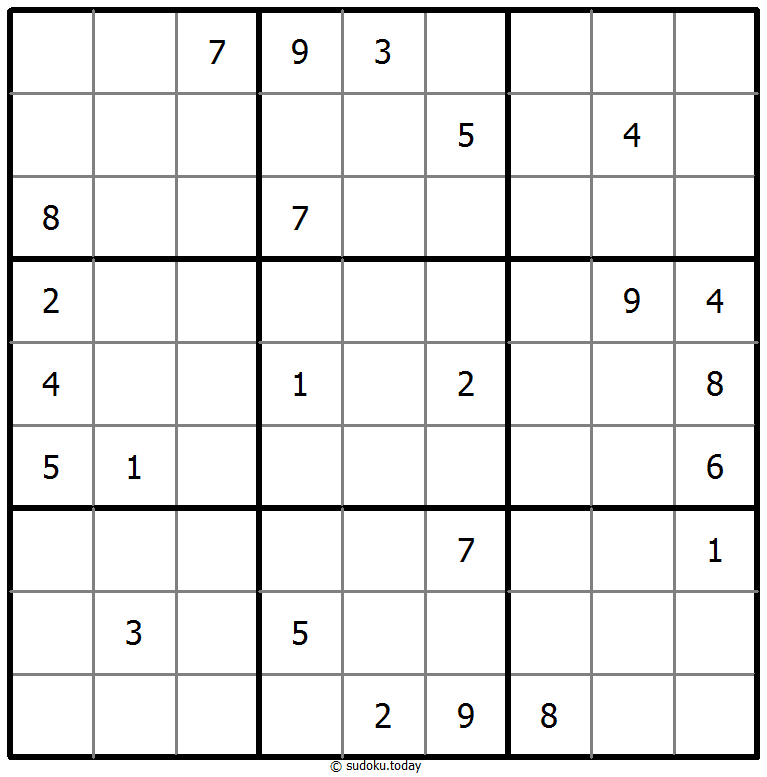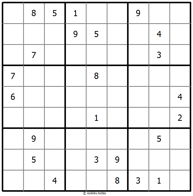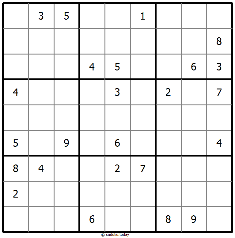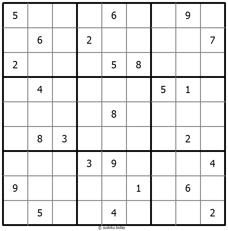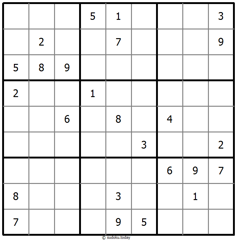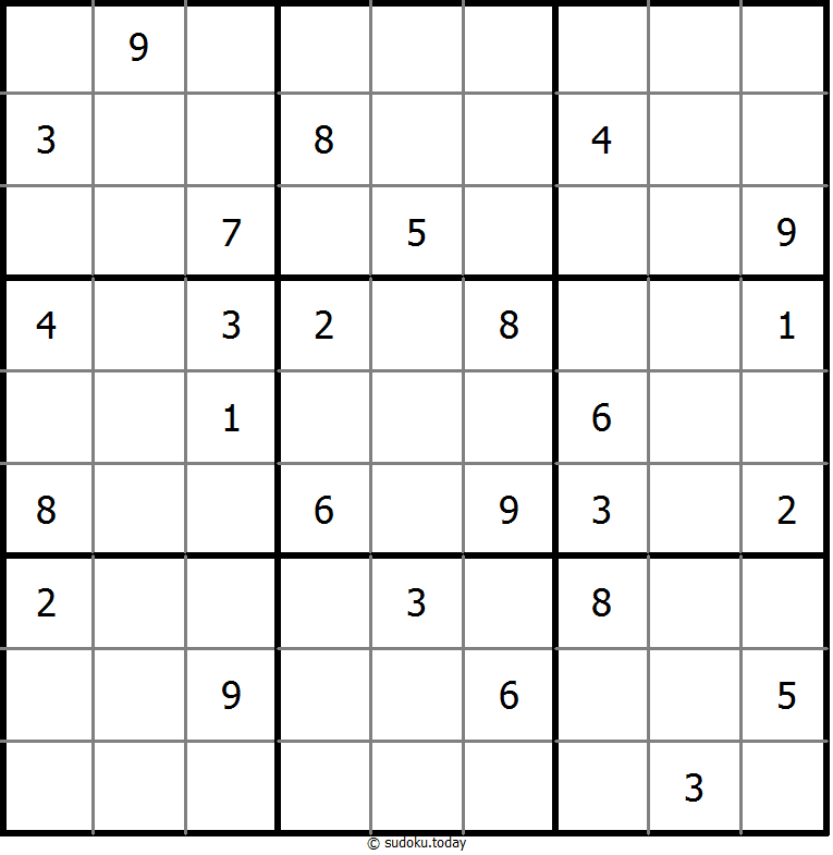1부터 9까지의 숫자를 각 빈 칸에 넣어, 각 숫자가 각 행, 열, 그리고 9개의 3x3 영역에 정확히 한 번씩 등장하도록 합니다.