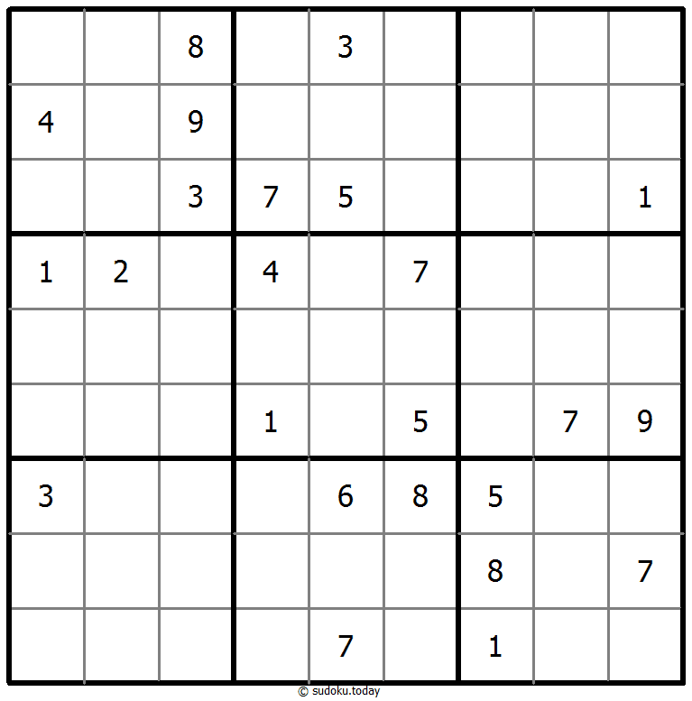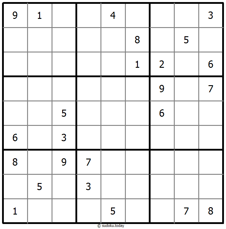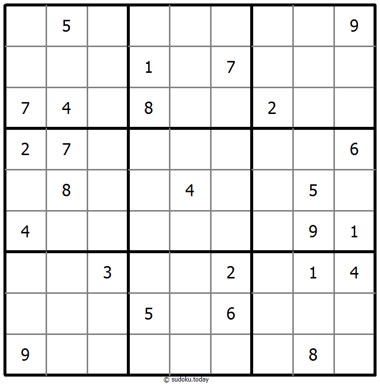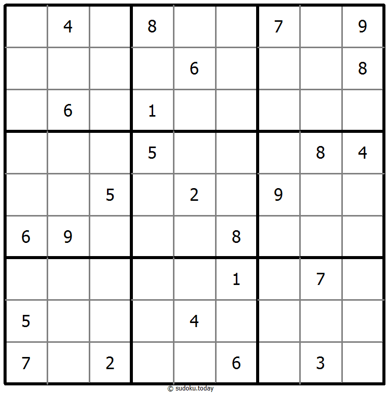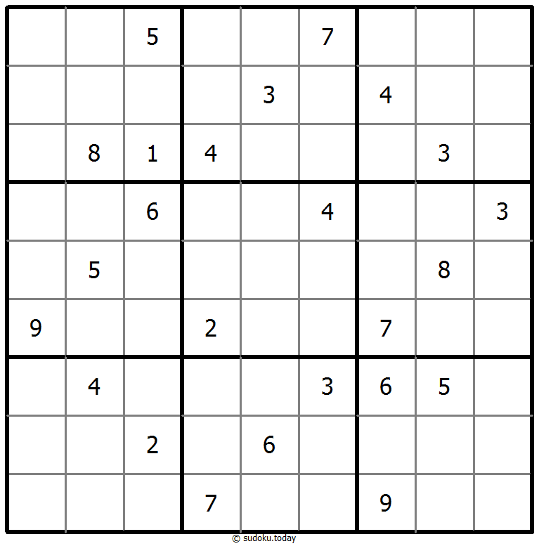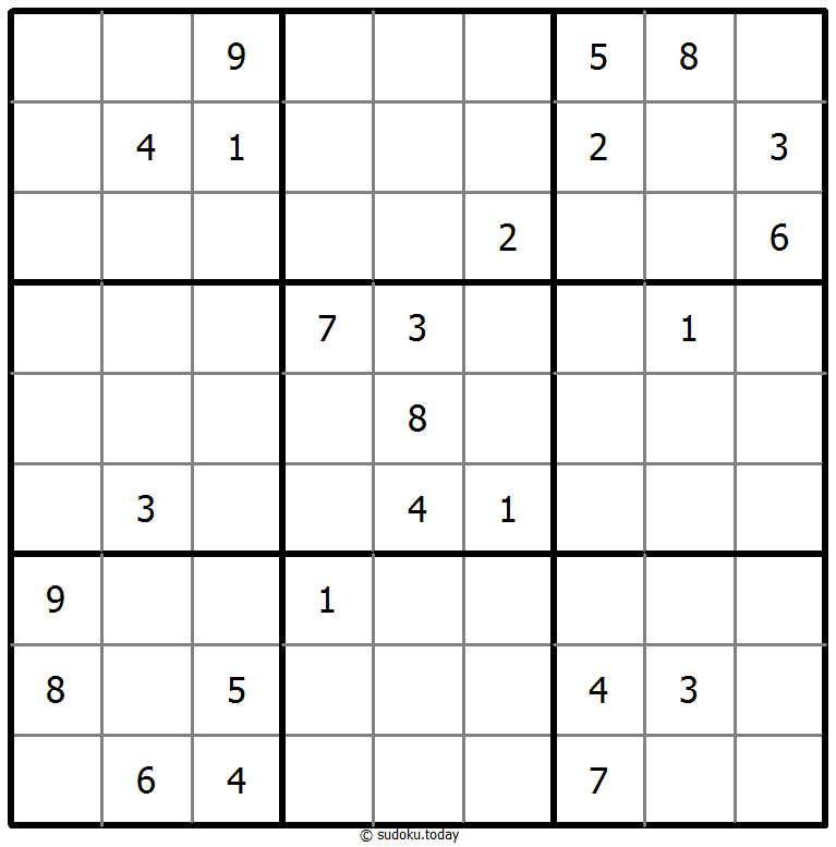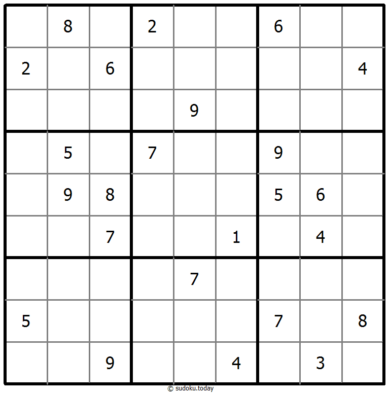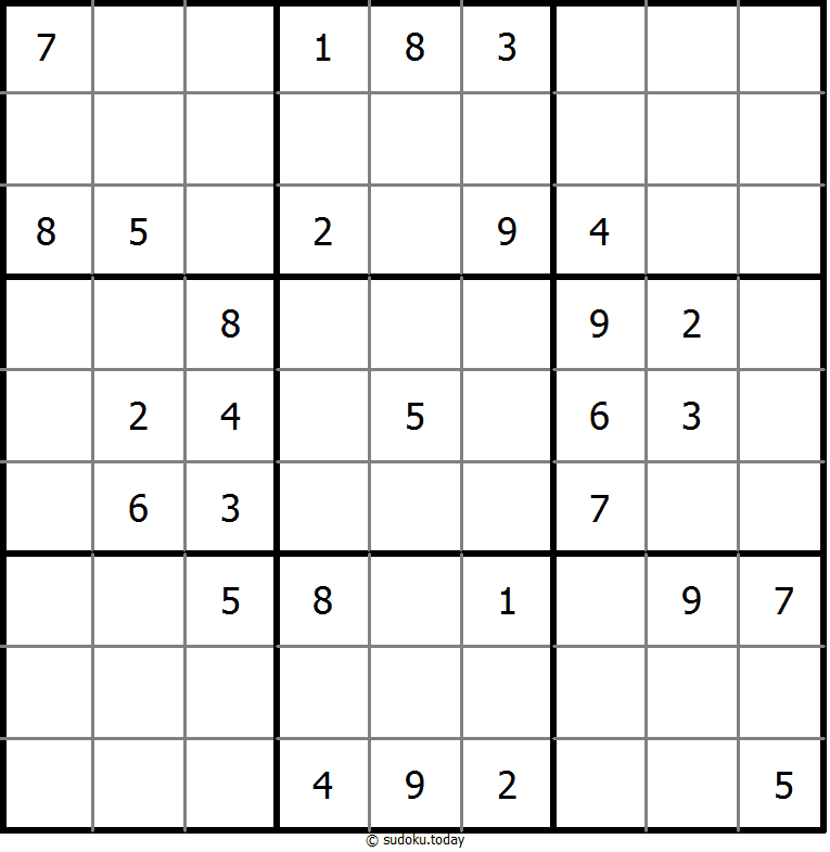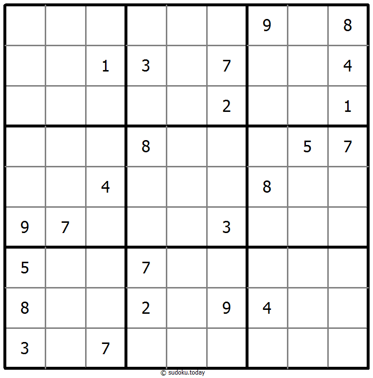 1부터 9까지의 숫자를 각 빈 칸에 넣어, 각 숫자가 각 행, 열, 그리고 9개의 3x3 영역에 정확히 한 번씩 등장하도록 합니다.
