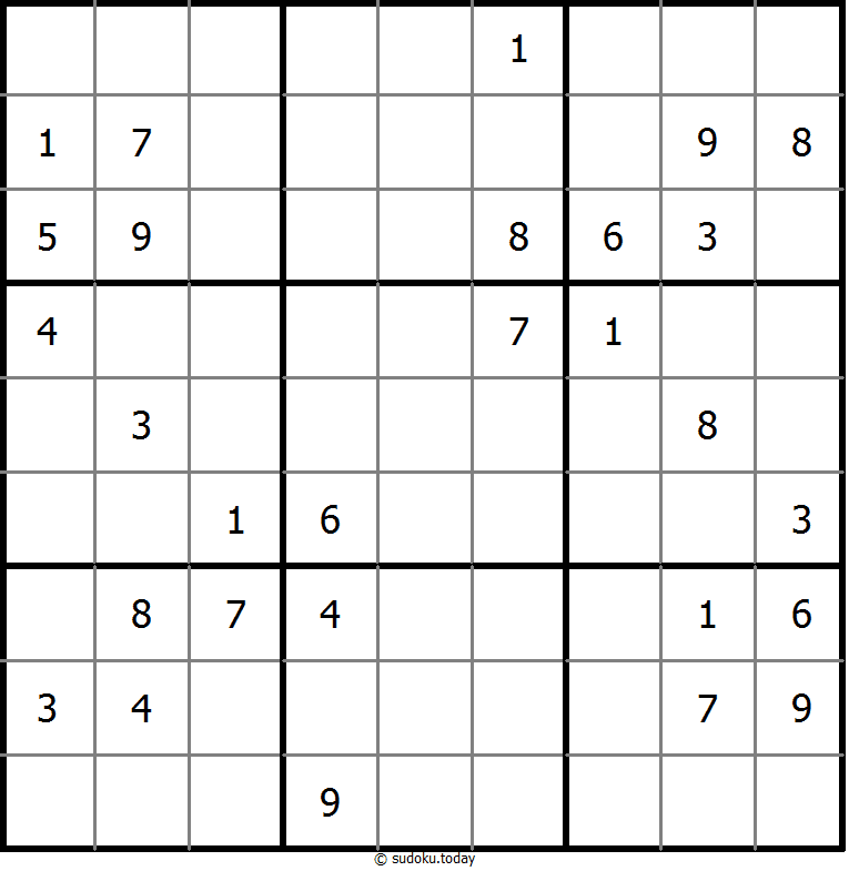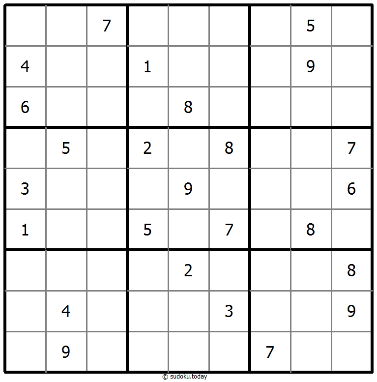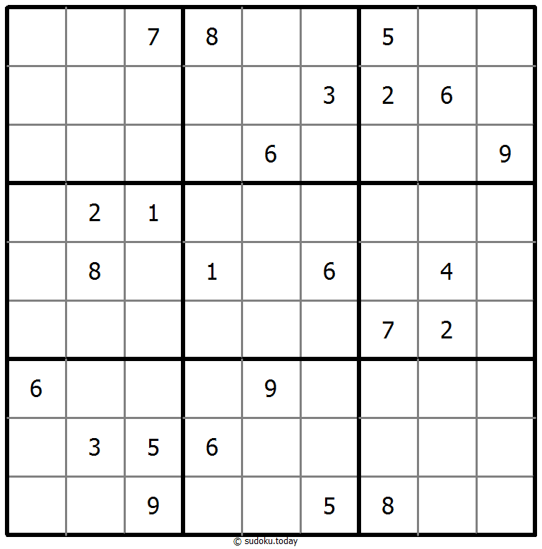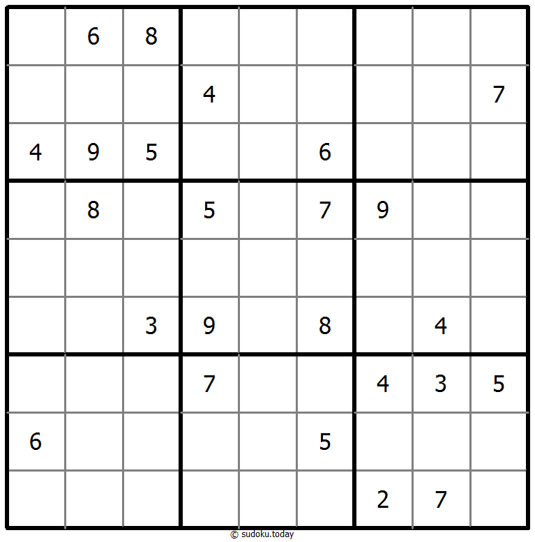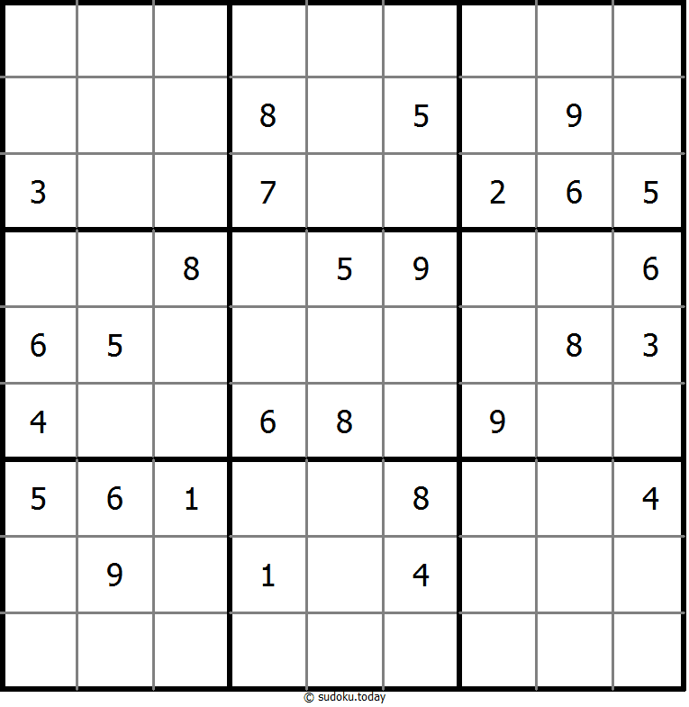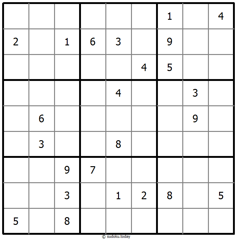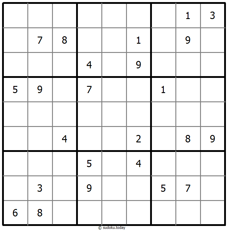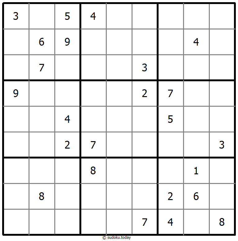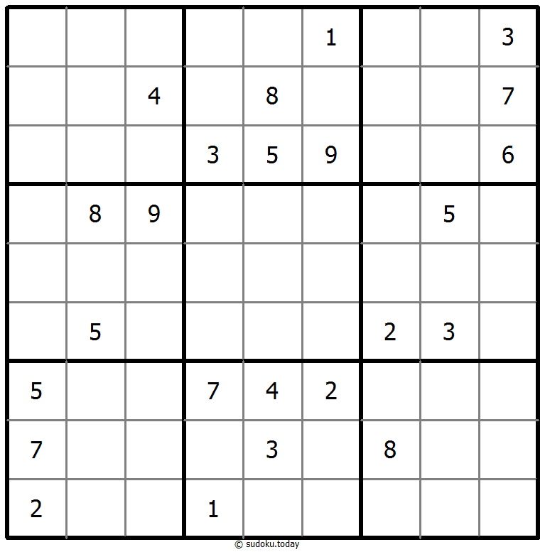 1부터 9까지의 숫자를 각 빈 칸에 넣어, 각 숫자가 각 행, 열, 그리고 9개의 3x3 영역에 정확히 한 번씩 등장하도록 합니다.