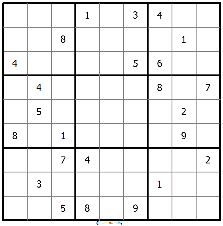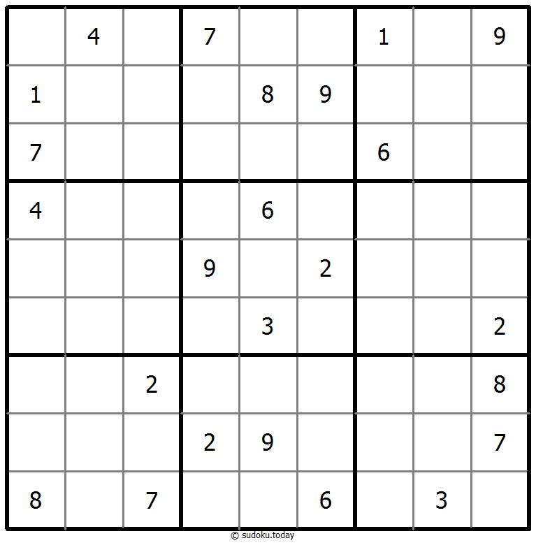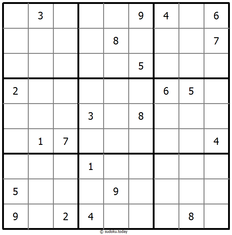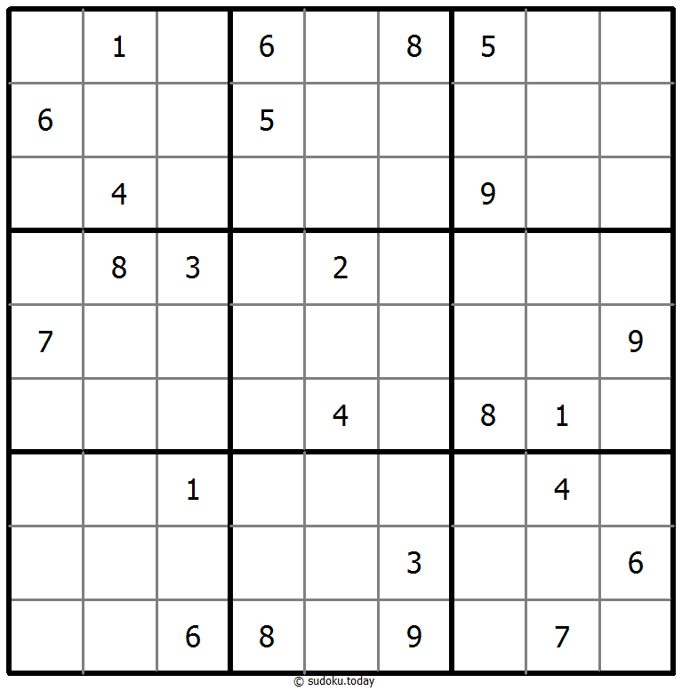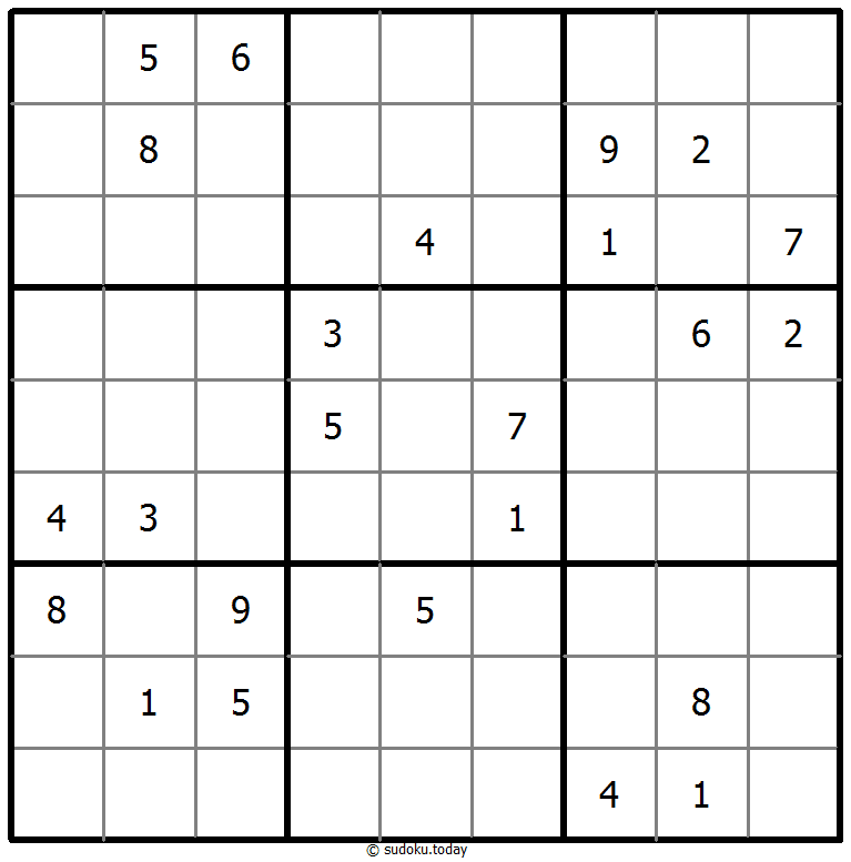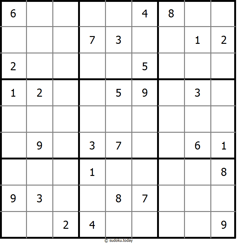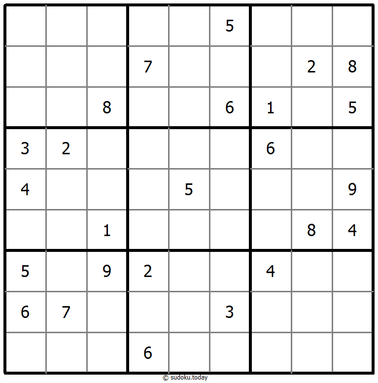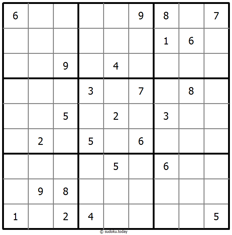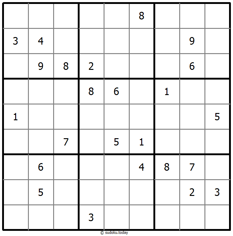 1부터 9까지의 숫자를 각 빈 칸에 넣어, 각 숫자가 각 행, 열, 그리고 9개의 3x3 영역에 정확히 한 번씩 등장하도록 합니다.