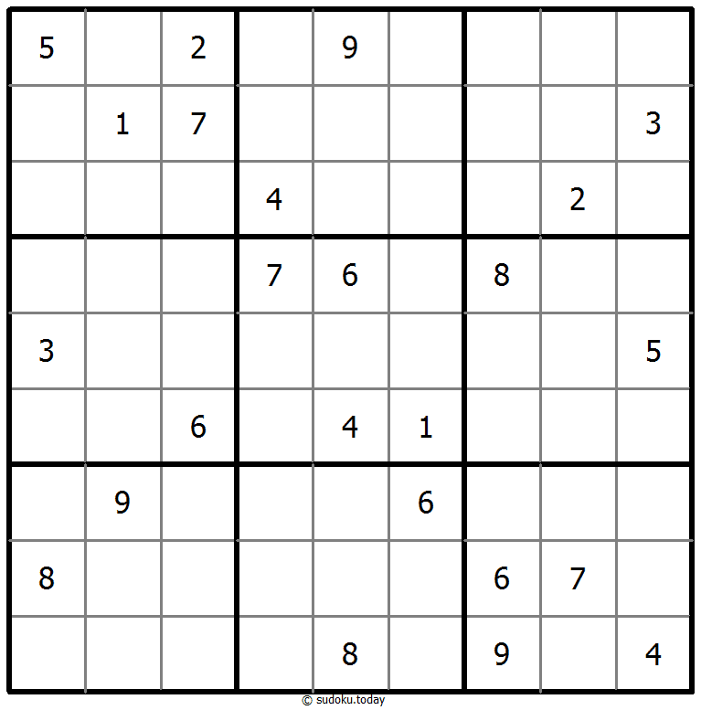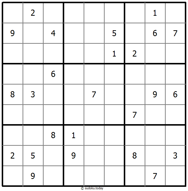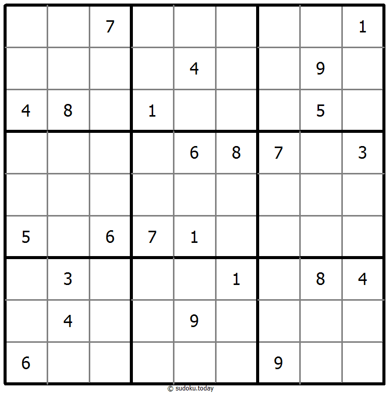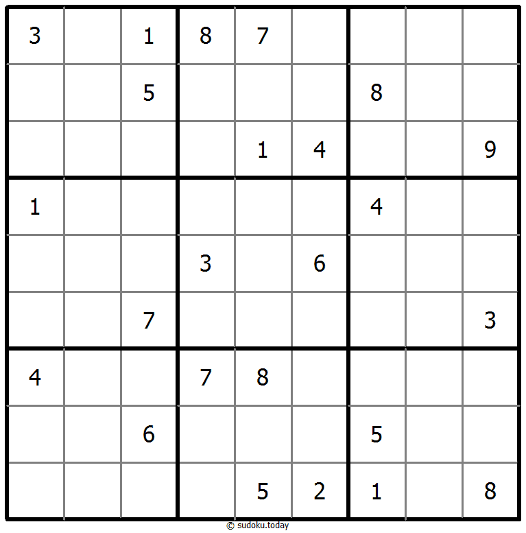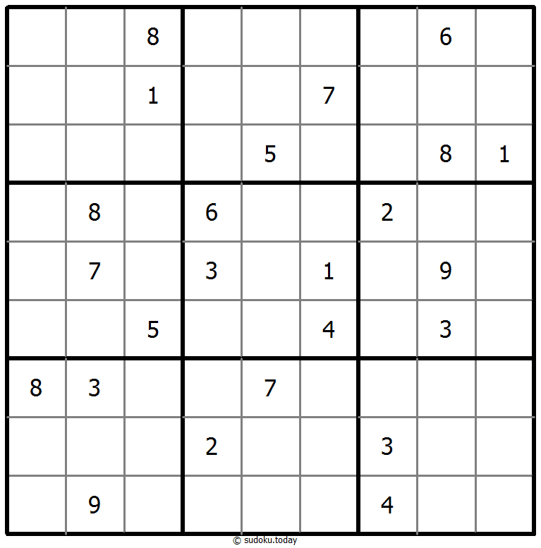 ใส่ตัวเลข 1 ถึง 9 ลงในแต่ละช่องว่าง เพื่อให้แต่ละตัวเลขปรากฏเพียงครั้งเดียวในแต่ละแถว คอลัมน์ และในแต่ละพื้นที่ 3x3 ทั้ง 9 พื้นที่