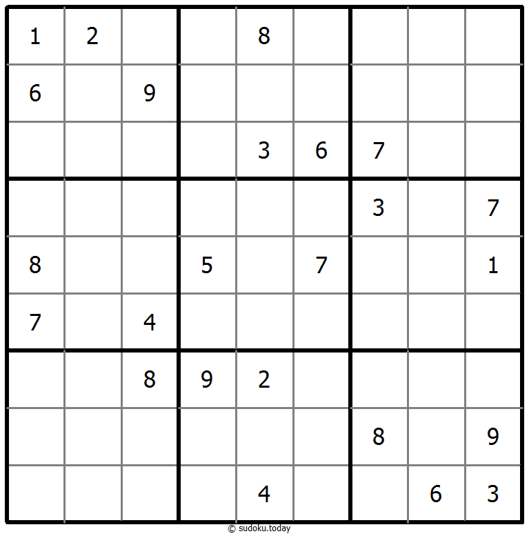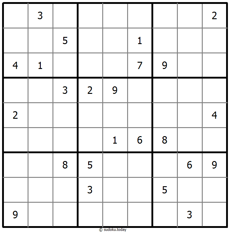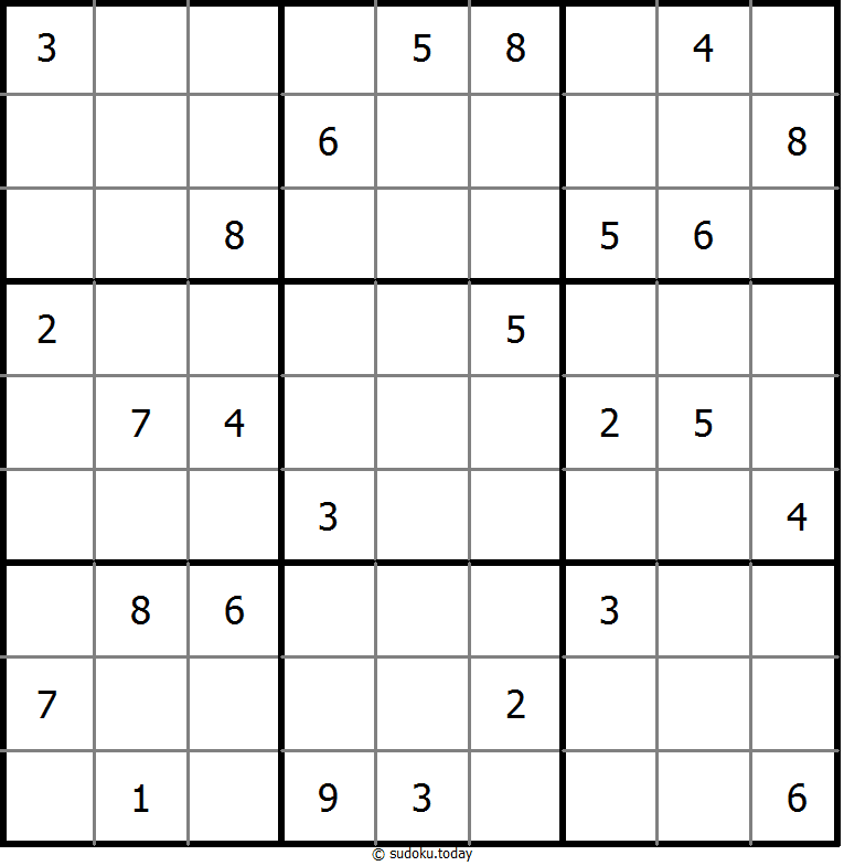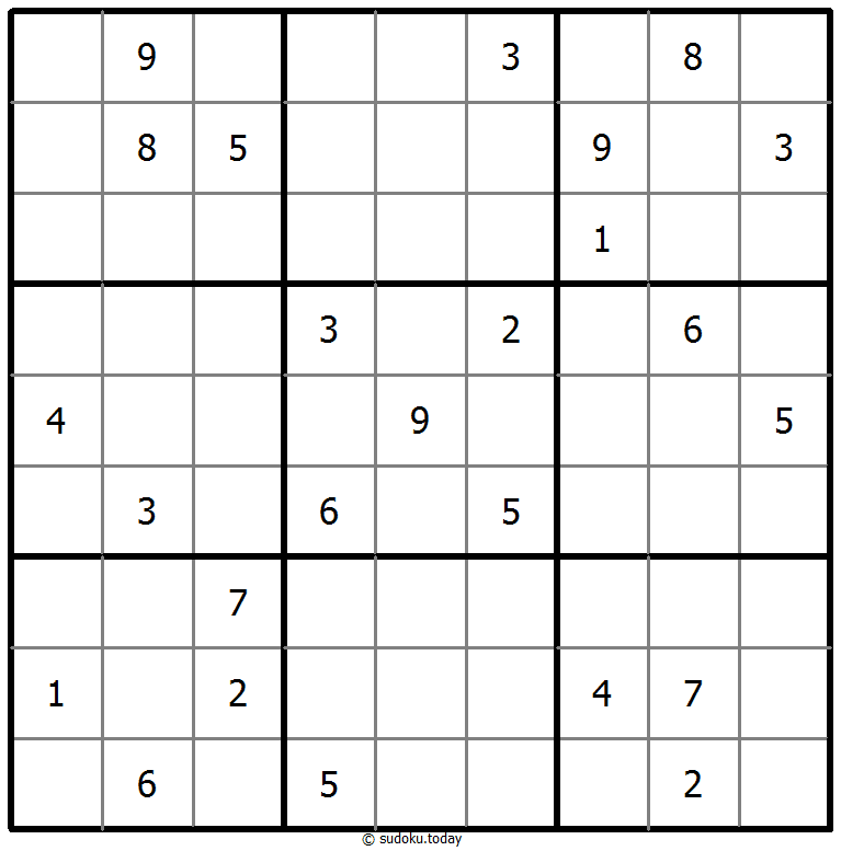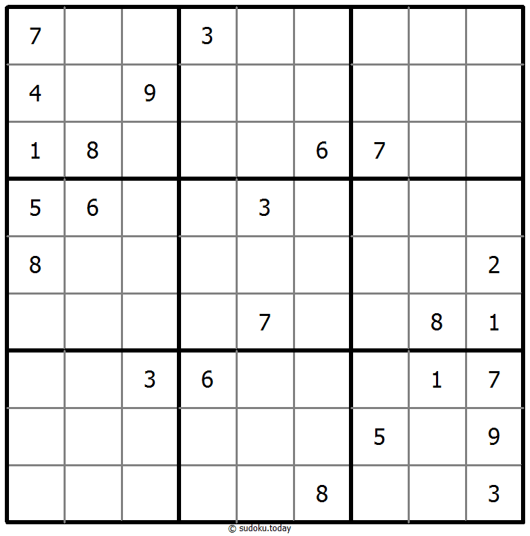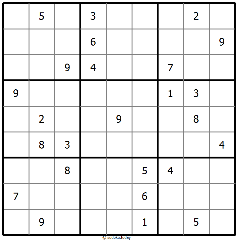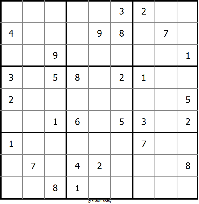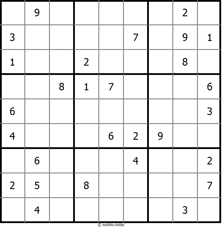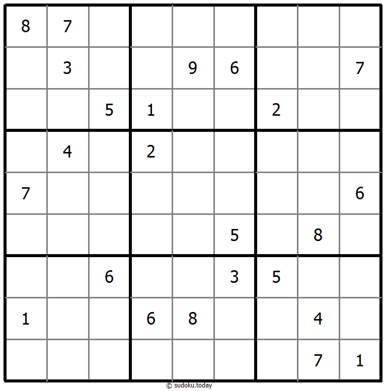 Заповніть кожну порожню клітинку цифрами від 1 до 9 так, щоб кожне число з’являлося один раз у кожному рядку, стовпчику і 3×3 блоці.