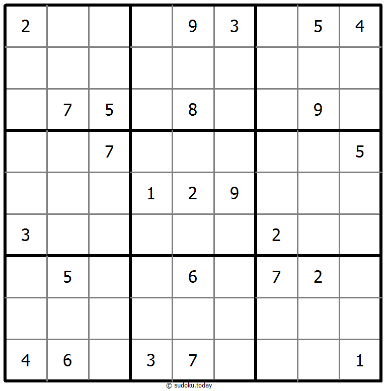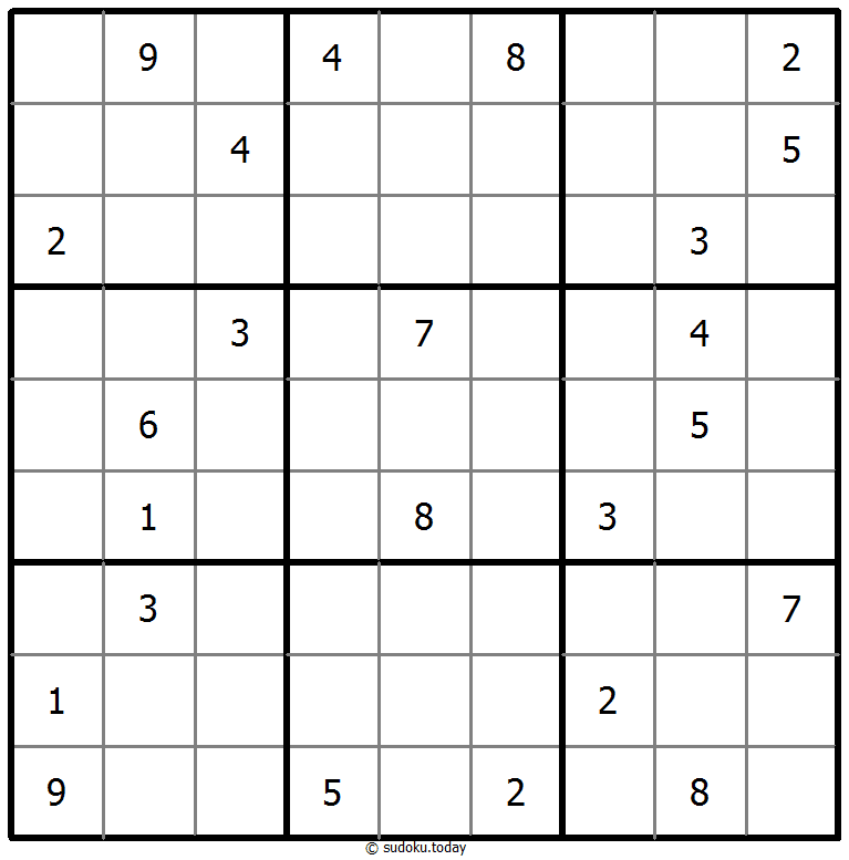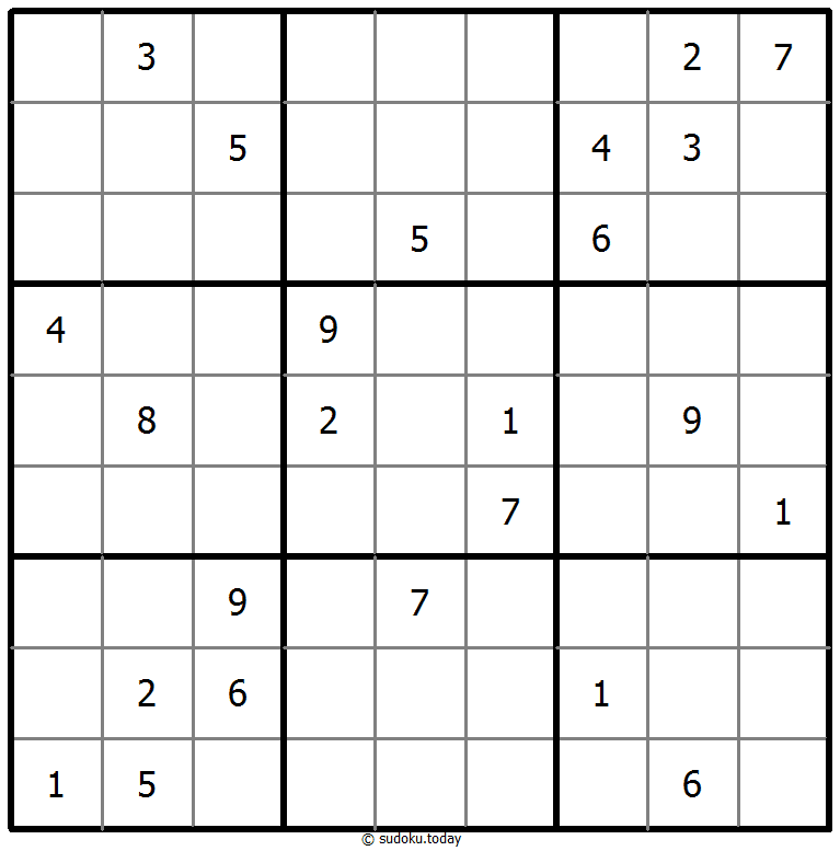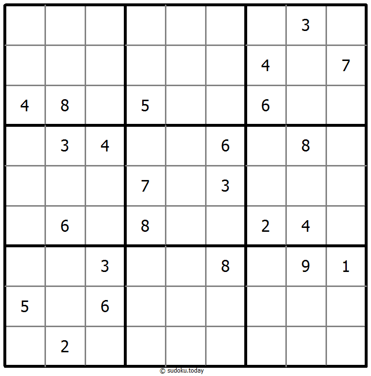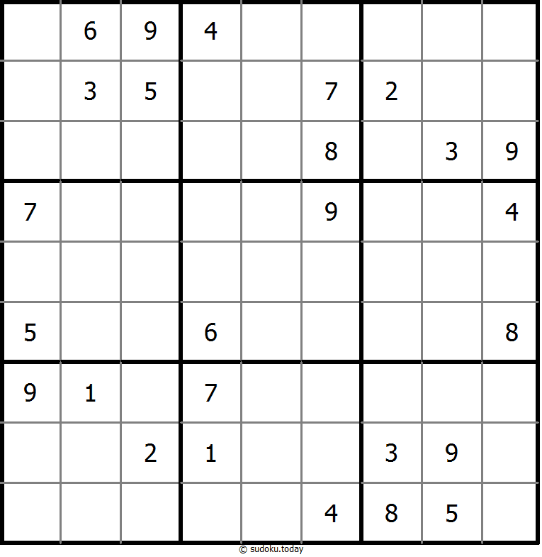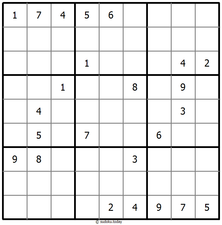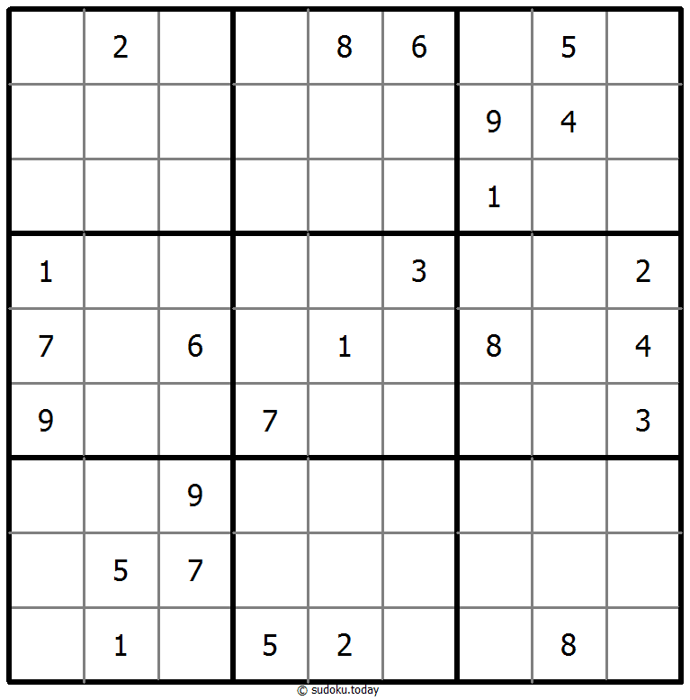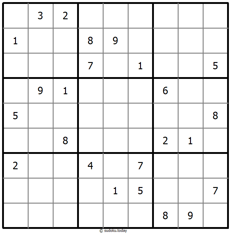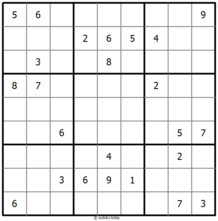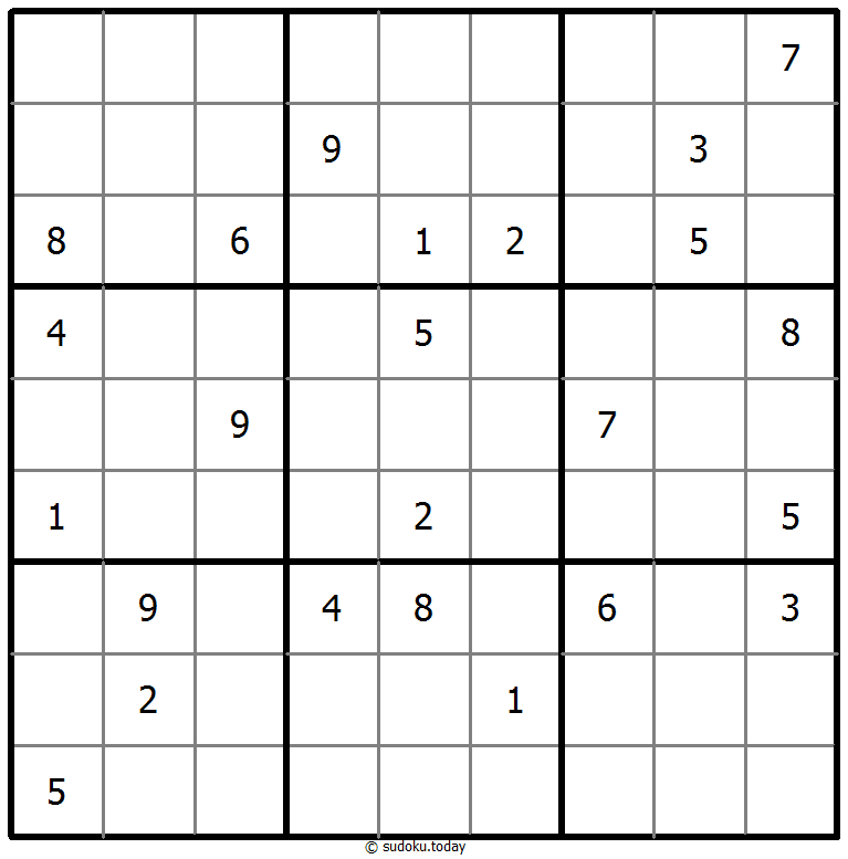 Заповніть кожну порожню клітинку цифрами від 1 до 9 так, щоб кожне число з’являлося один раз у кожному рядку, стовпчику і 3×3 блоці.