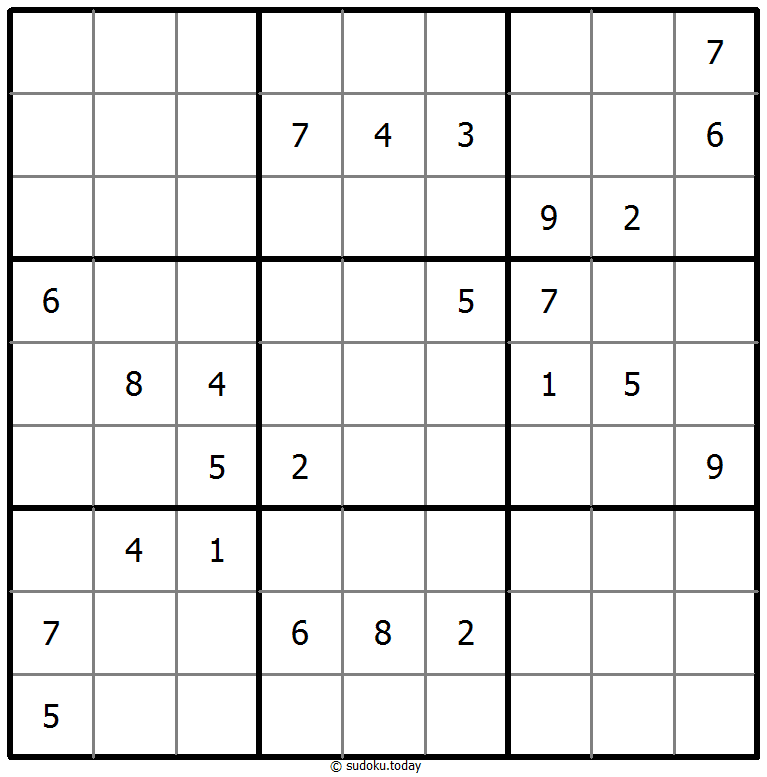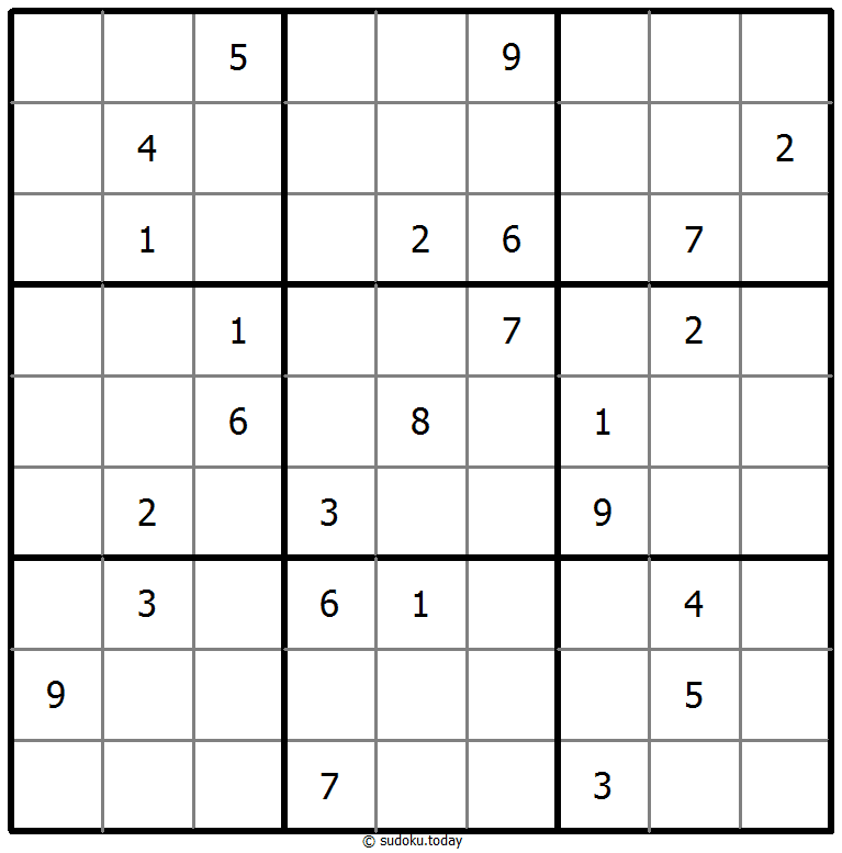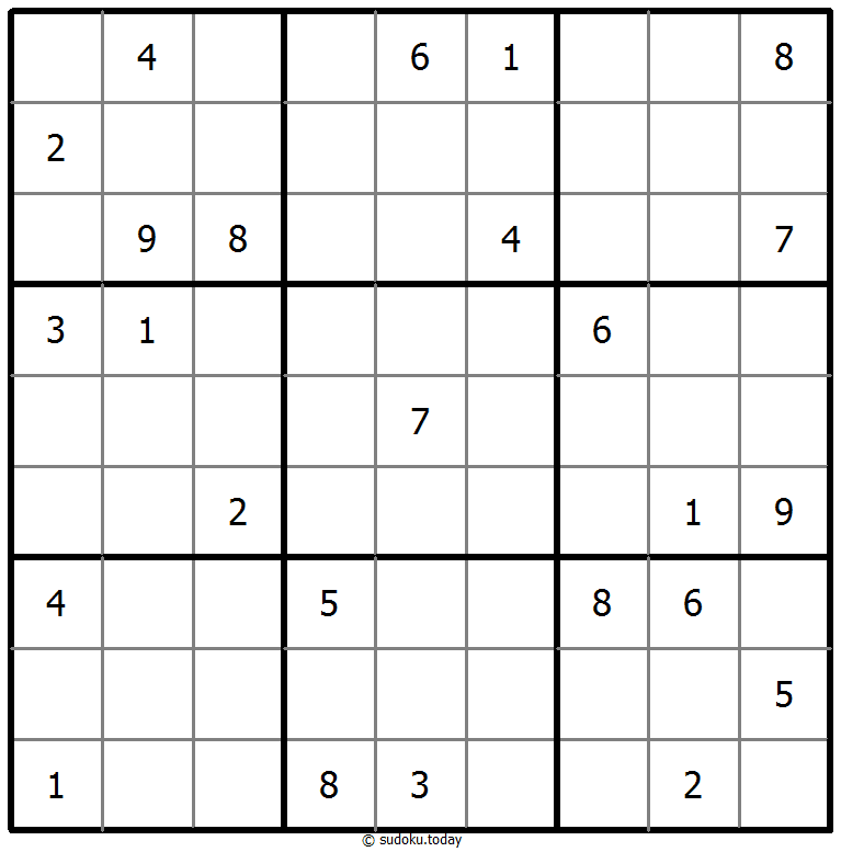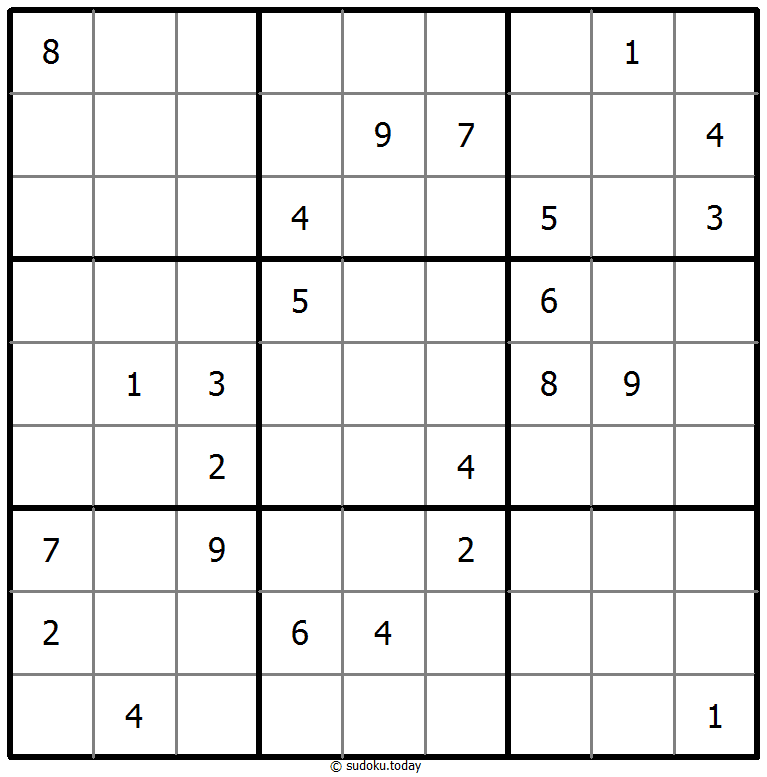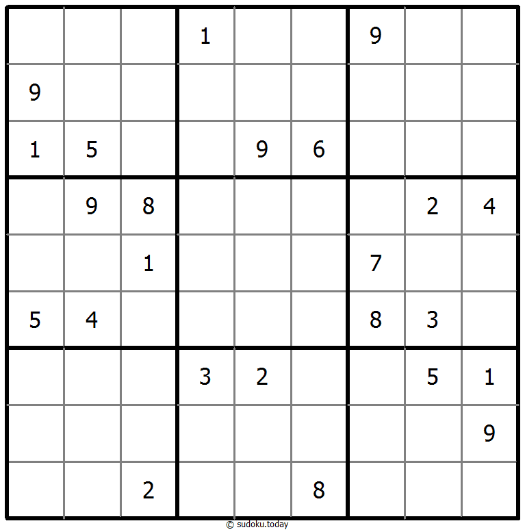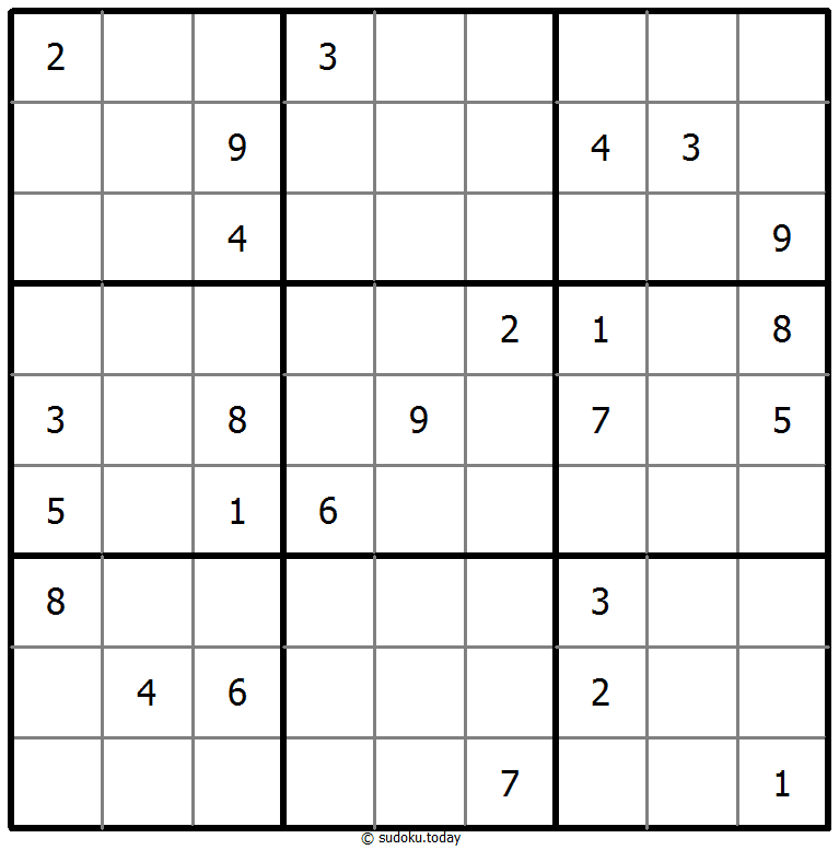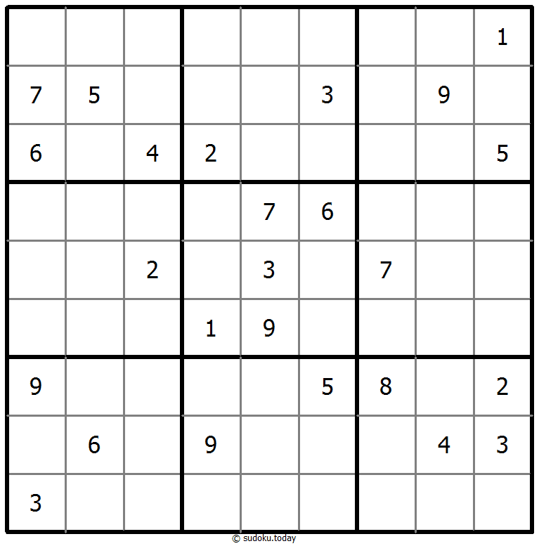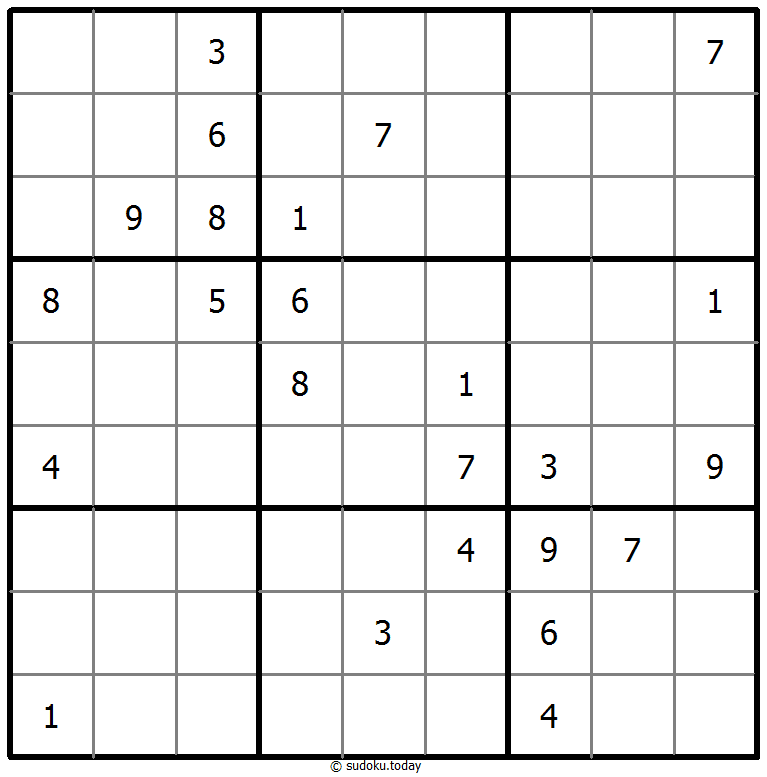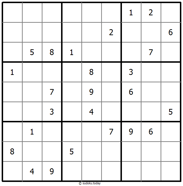 Заповніть кожну порожню клітинку цифрами від 1 до 9 так, щоб кожне число з’являлося один раз у кожному рядку, стовпчику і 3×3 блоці.