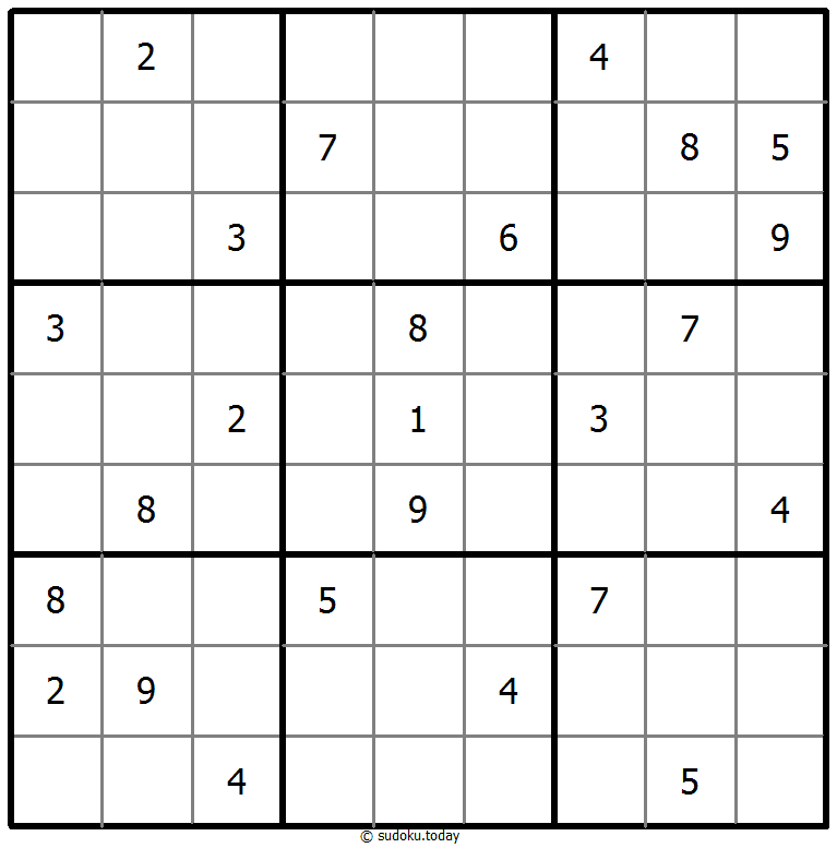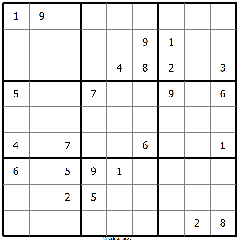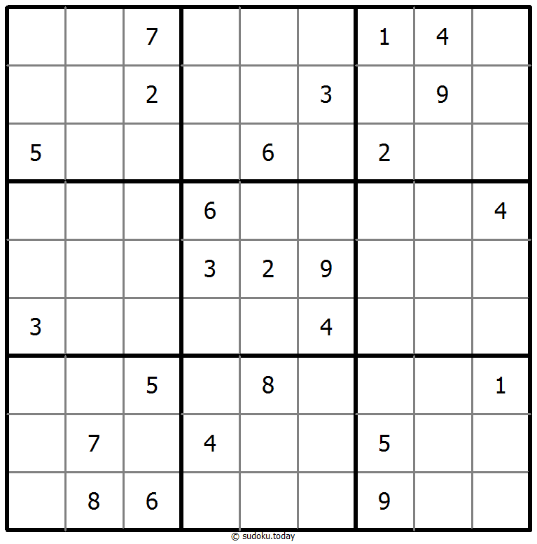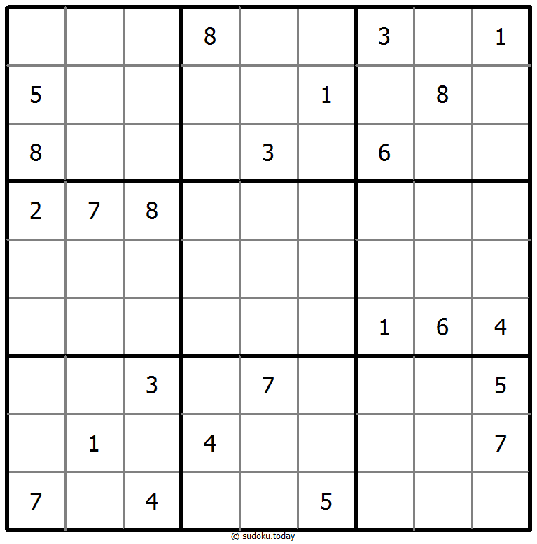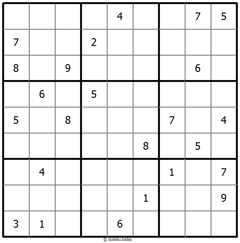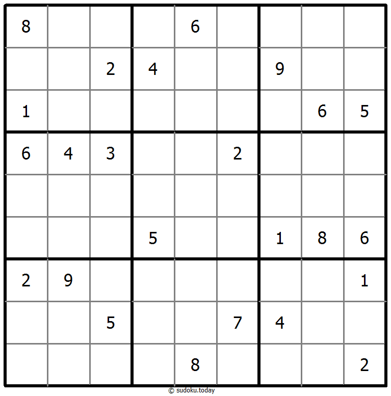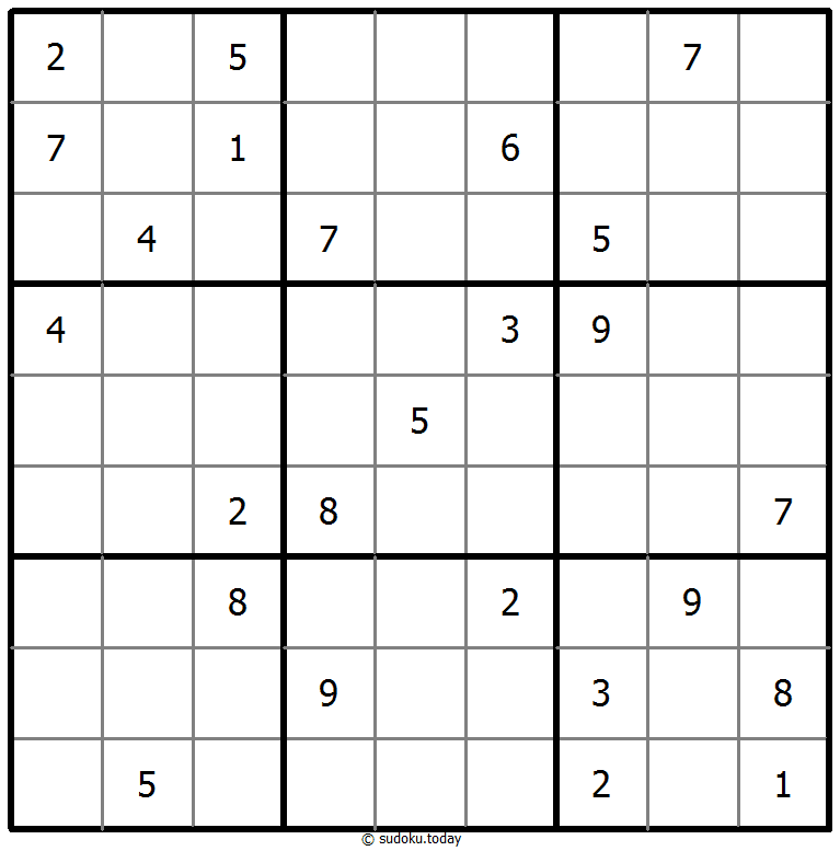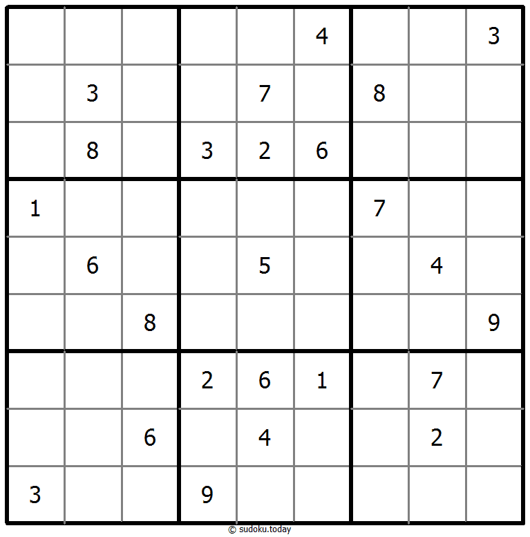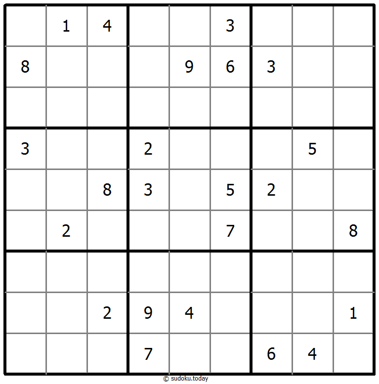 Заповніть кожну порожню клітинку цифрами від 1 до 9 так, щоб кожне число з’являлося один раз у кожному рядку, стовпчику і 3×3 блоці.